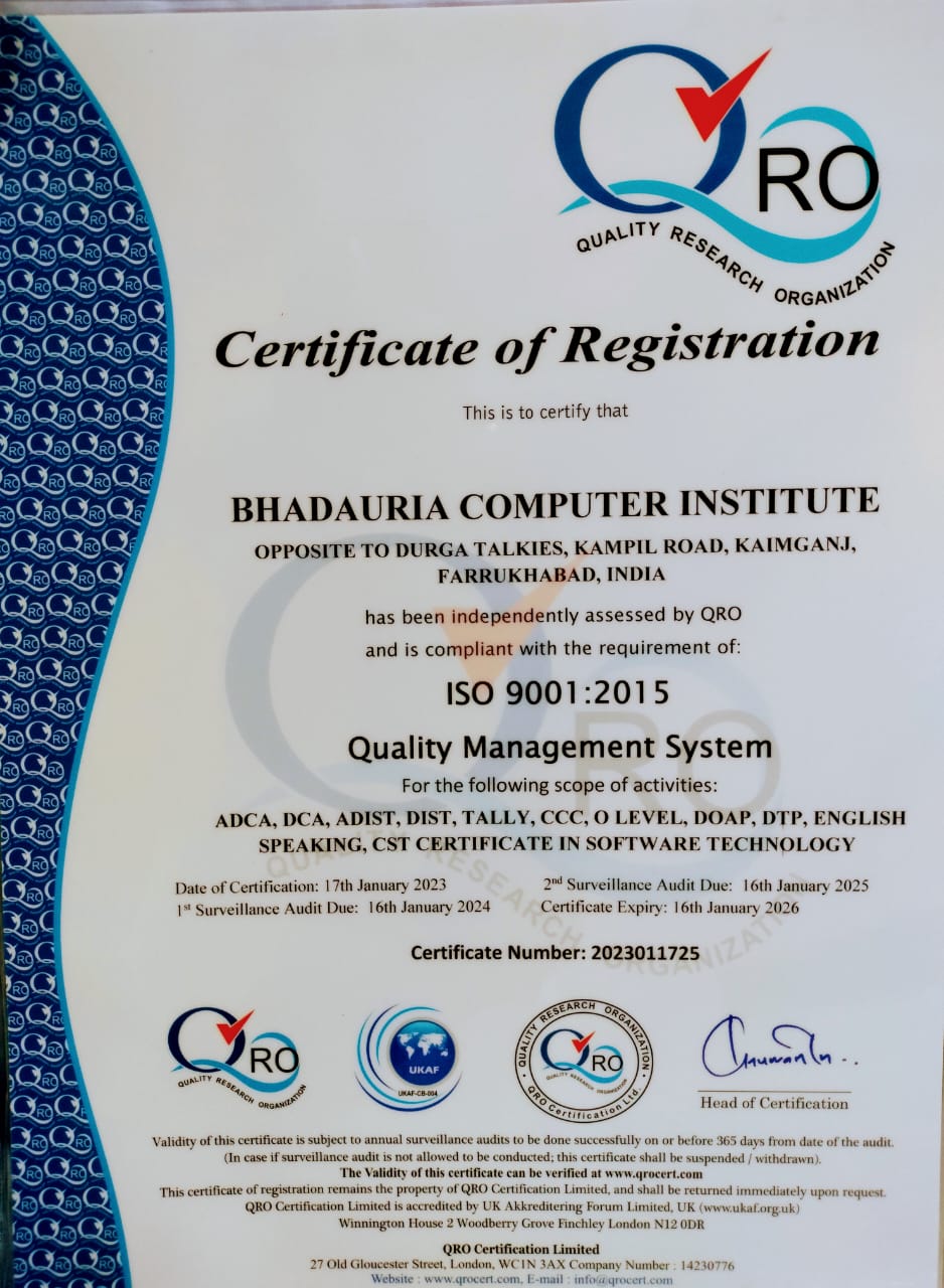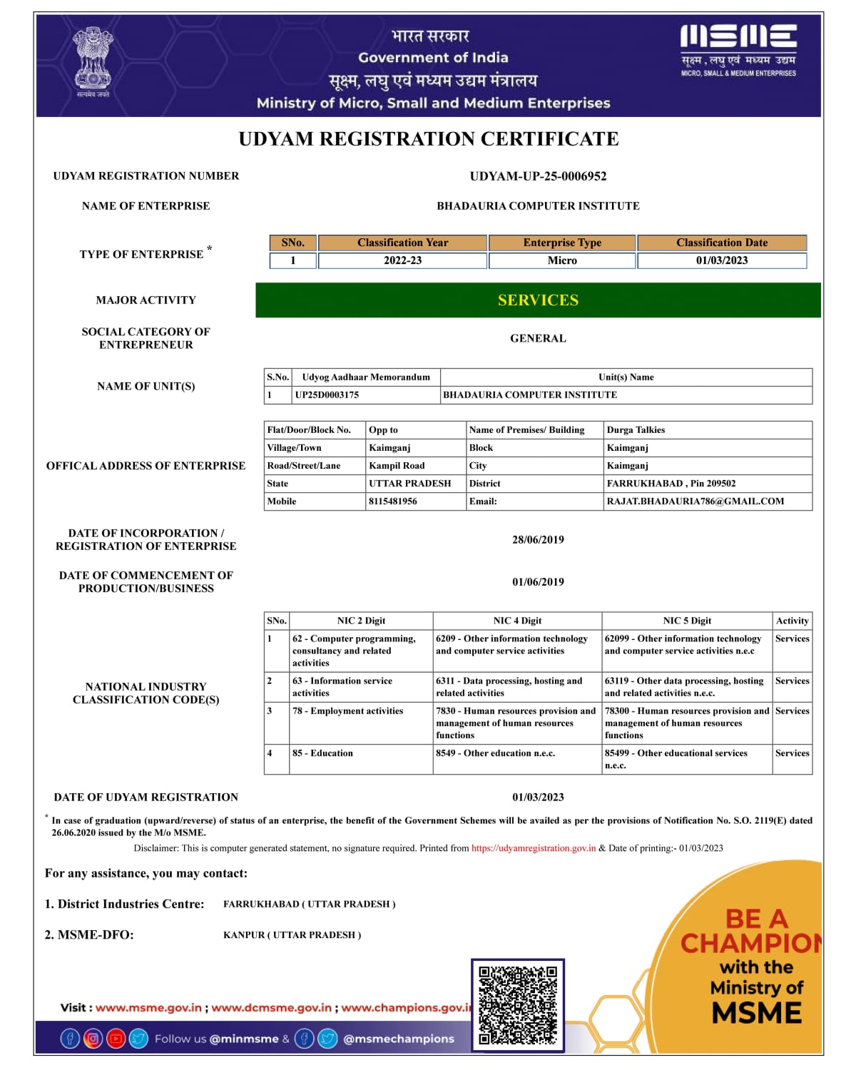 BHADAURIA INSTITUTE OF SKILL DEVELOPMENT | Opposite to Durga Talkies, Kampil Road, Kaimganj, Farrukhabad, Uttar Pradesh, India